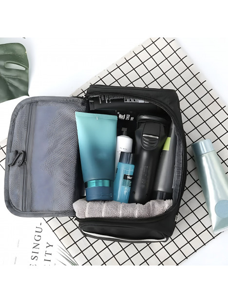Kosmetyczka została zaprojektowana tak, aby pomieścić wszystkie niezbędne produkty pielęgnacyjne i akcesoria. Wewnątrz znajdziesz główną przestrzeń na większe kosmetyki, takie jak żele pod prysznic, szampony czy dezodoranty, oraz dodatkowe kieszonki ułatwiające organizację mniejszych przedmiotów, jak maszynki do golenia, szczoteczki do zębów czy małe flakony perfum. Funkcjonalny układ wnętrza pozwala na utrzymanie porządku i szybki dostęp do wszystkich produktów.